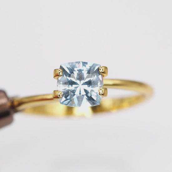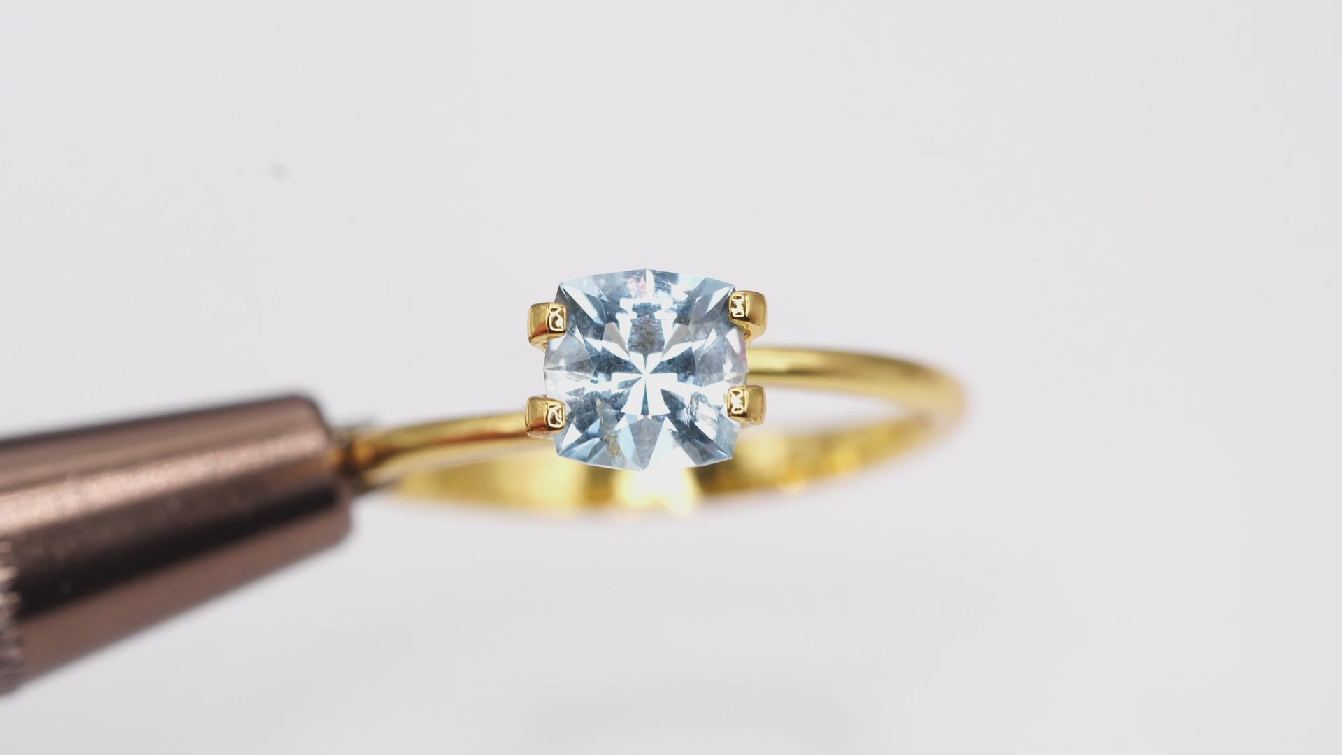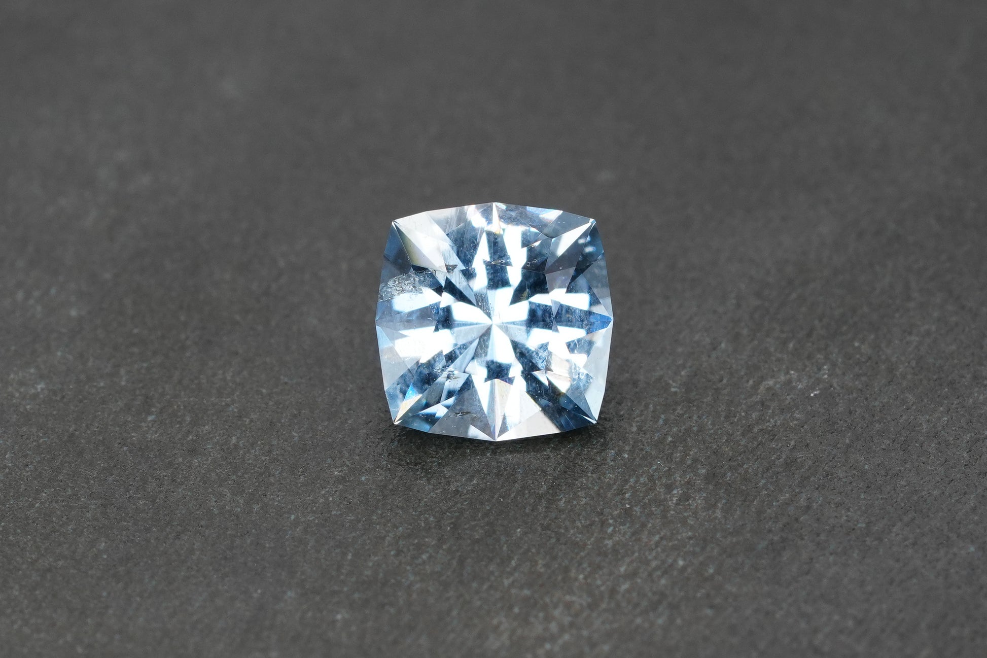 A delicate light blue Aquamarine showcasing a soft, watery brilliance. Its cushion cut enhances sparkle while maintaining a classic elegance. This gem has a small feather inclusion adding a natural character without detracting from its overall beauty.