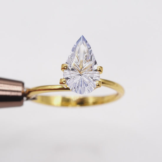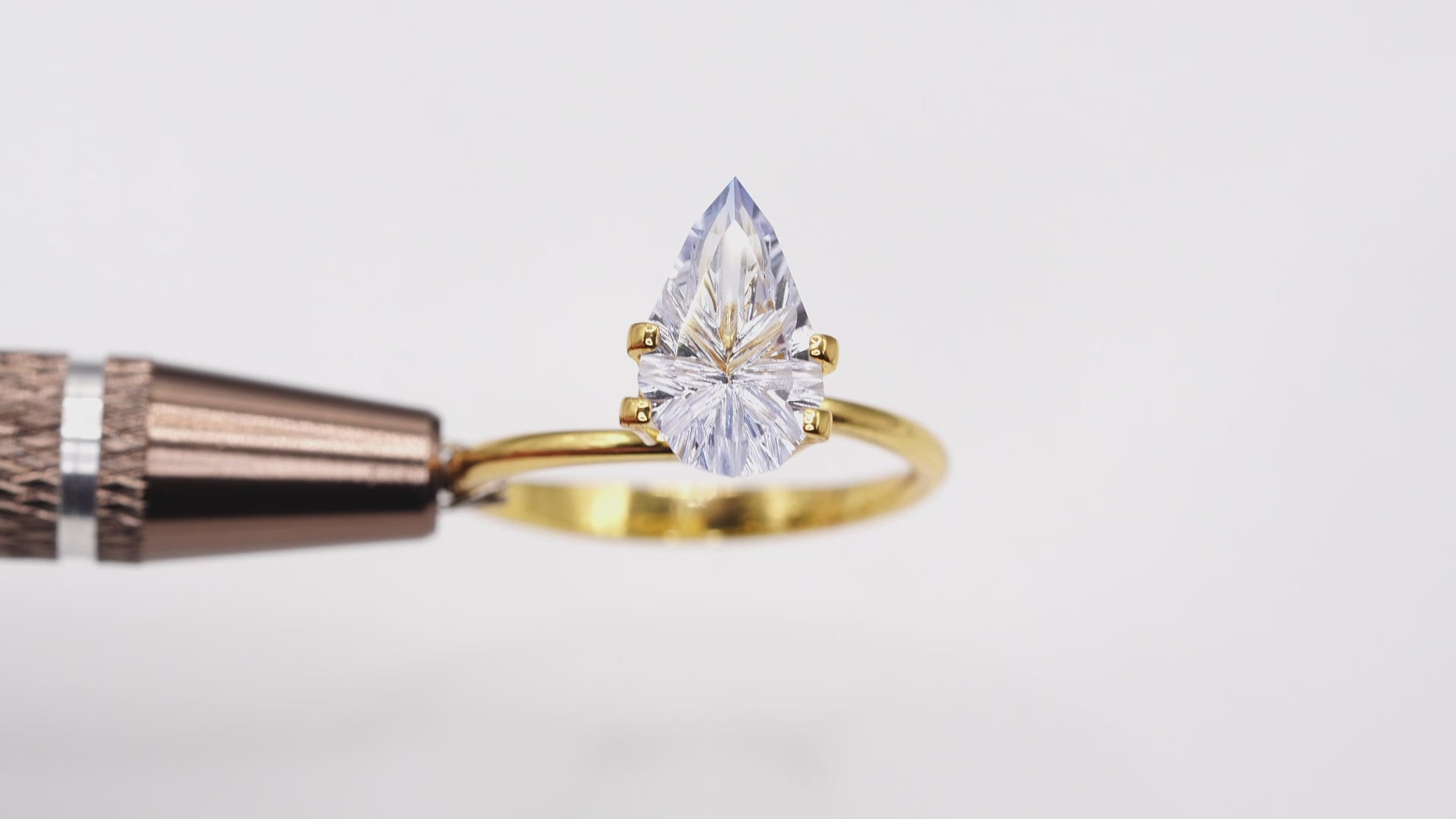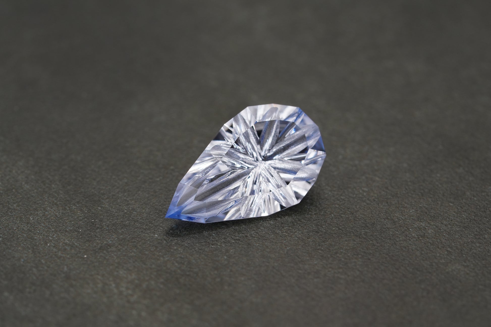 A stunning lab sapphire featuring a mesmerizing fantasy cut, showcasing intricate facets that dance with light from every angle. Its broad face and shallow depth create an elegant play of brilliance and color, making it an eye-catching centerpiece for a custom design.