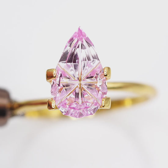 A lab grown pink sapphire cut into a fantasy elongated hexagon shape. This stone has bright internal flash, a vivid pink hue, and a sleek elongated form that gives it a very elegant and modern presence.