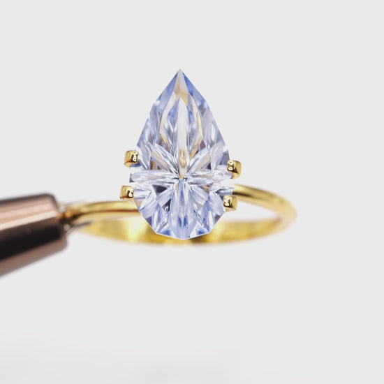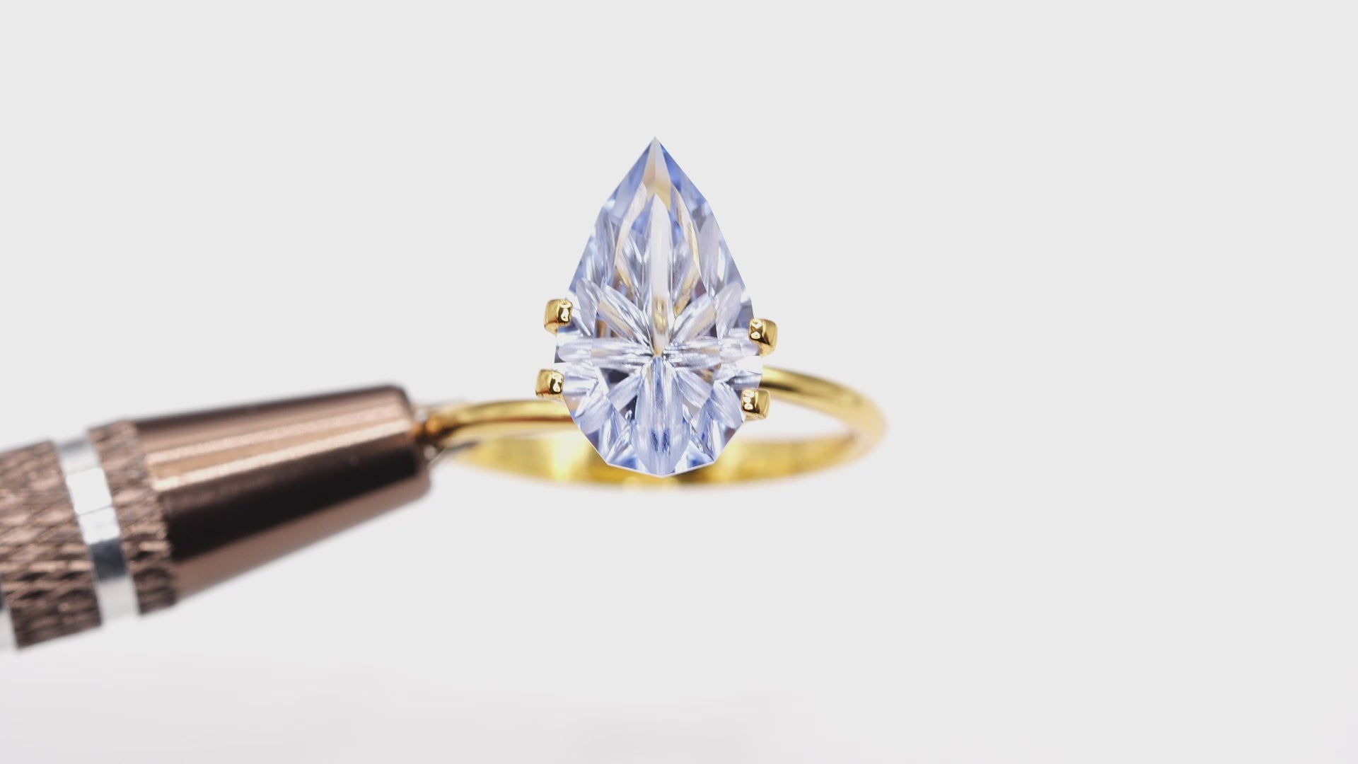 A stunning lab sapphire featuring a mesmerizing fantasy cut, showcasing intricate facets that dance with light from every angle. Its broad face and shallow depth create an elegant play of brilliance and color, making it an eye-catching centerpiece for a custom design.