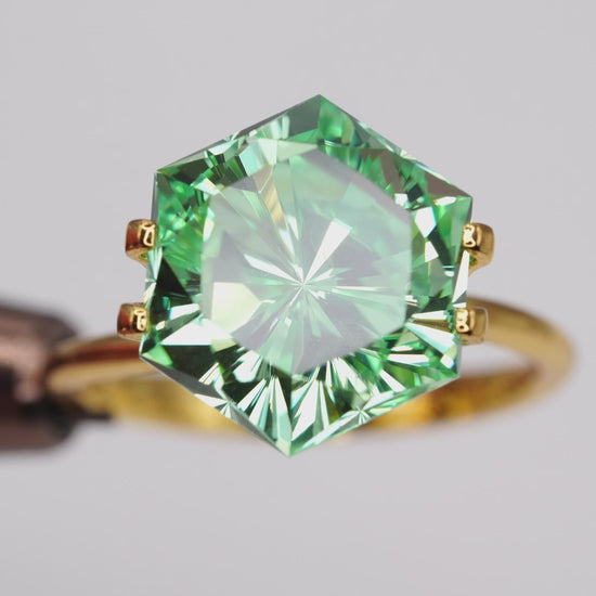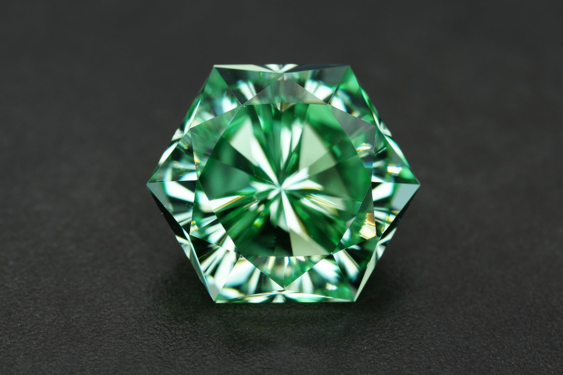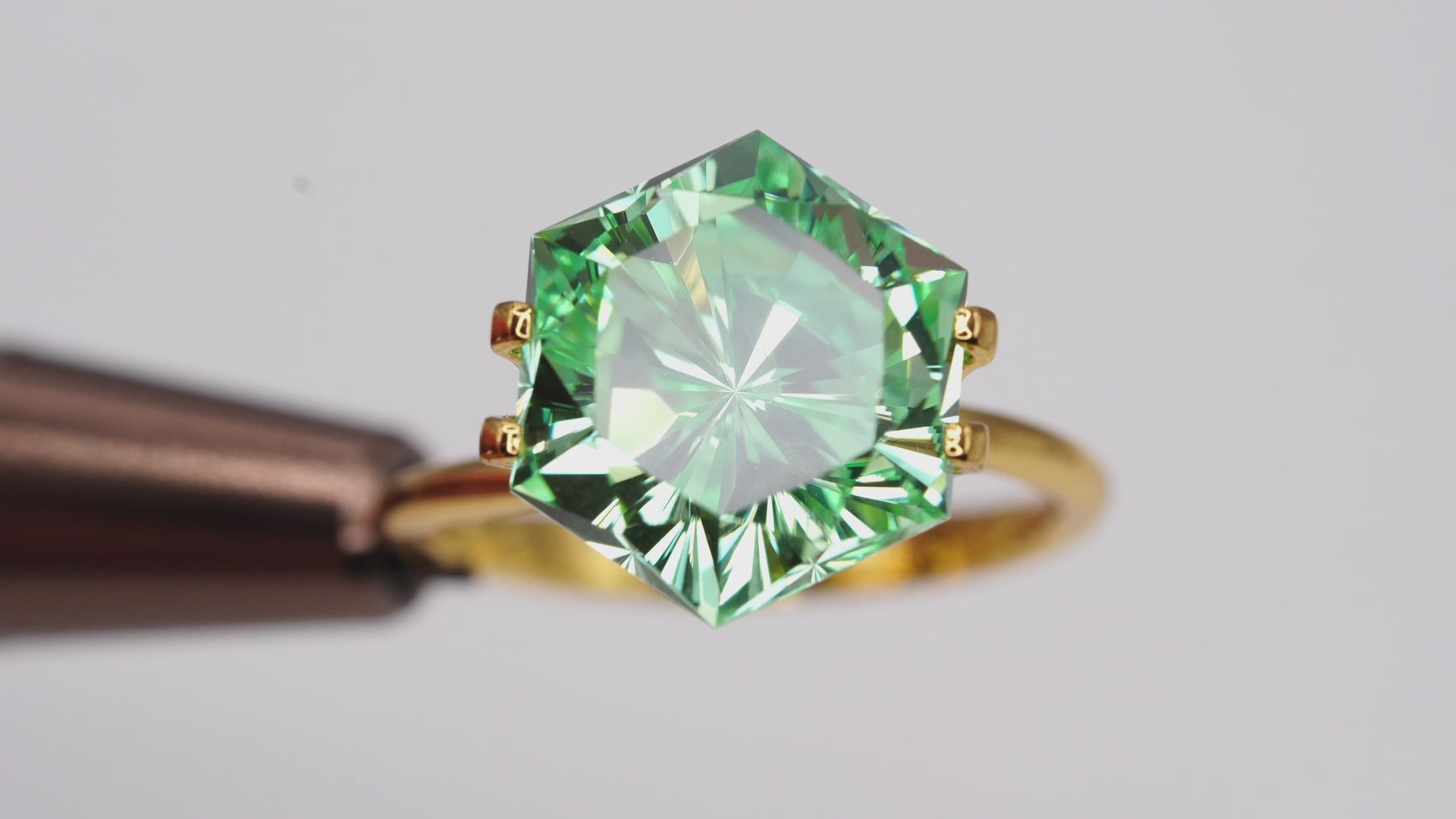 A lab grown green sapphire cut into a hexagon shape. This stone has a vivid green color with strong brightness and a powerful geometric presence because of the shape and size.