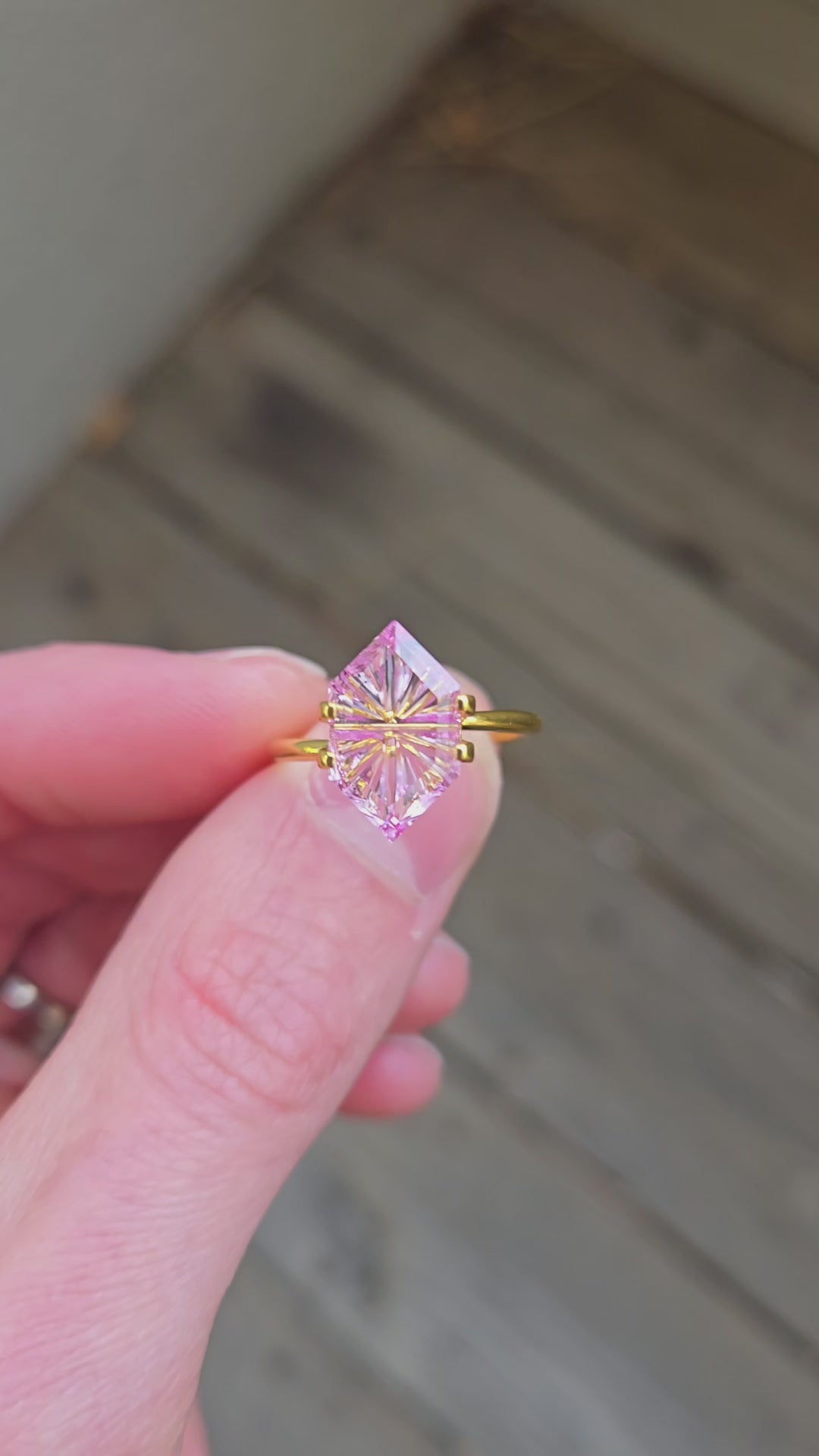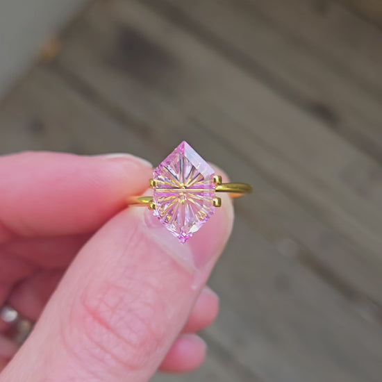 A lab grown pink sapphire cut into a fantasy elongated hexagon shape. This stone has bright internal flash, a vivid pink hue, and a sleek elongated form that gives it a very elegant and modern presence.